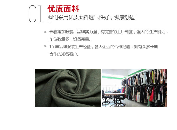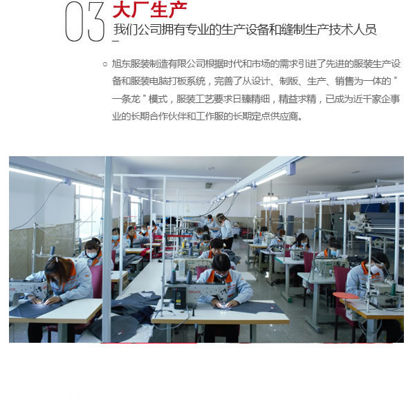 吉林省長春市旭東服裝廠,電話:13578777918,提供工作服,工裝定制,勞保服,保安服,職業裝定制,本公司是一家集生產,設計,制作,銷售為一體的多元化公司。長春市旭東服裝制造有限公司成立于2003...[查看更多]